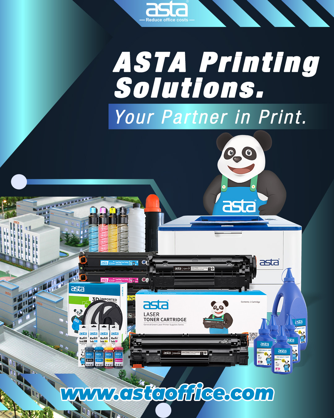 ASTA provides one-stop printing solutions for distributors, wholesalers and brand owners worldwide. From laser toner cartridges and refill ink to office printers and 3D filament, we help you consolidate suppliers, cut costs and keep your customers’ printers running smoothly. With a professional factory background and strict quality control, ASTA delivers the consistency, reliability and support your printing business needs to grow.